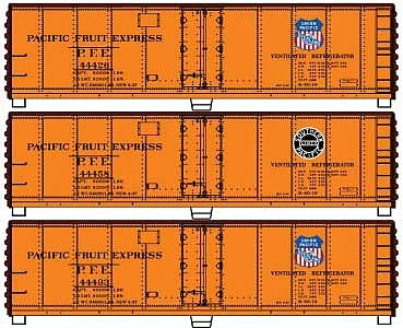 These are the HO Scale 40′ Steel Reefer kits Pacific Fruit Express 3 car pack model train freight car from Accurail.
