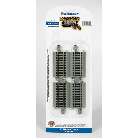 3″ Straight E-Z Track w/Nickel Silver Rail & Gray Roadbed (Package of 4) by Bachmann. / HO Scale. Item:BAC44512 Here’s 4 Pieces of Bachmann’s HO Scale Nickel Silver Track 3″Straight Sections of E-Z Track with Gray Roadbed.