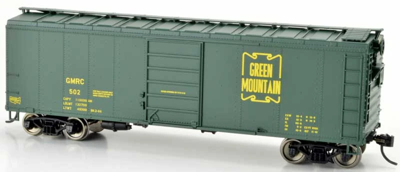 This is the HO Scale 40′ Single-Door Boxcar Ready to Run Green Mountain Railroad #502 model train freight car from Bowser Manufacturing Co.