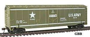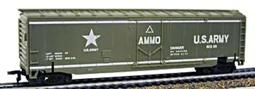 This is an HO Scale US Army Exploding Boxcar from the Military Action Series by Model Power. Features: Compatible with any HO scale train equipment, Detailed car body is molded in olive green plastic, Looks like an ordinary box car until hit by a missile (missile not included), When a missile hits the ammo carrying boxcar, it explodes!, Upon missile impact, car sides and top will explode from car base, Roofwalk, ladders, and brakewheel are molded in detail, U.S. Army 80299, AMMO, U.S. Army logo in white on each side, Detailed undercarriage, Free-rolling wheels.