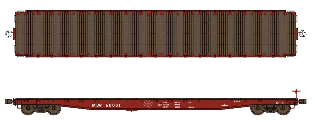 Wheels of Time 62′ Flatcars were 1960s and later favorites of the lumber and building materials industries where a clear 57′ loading deck was desired. Constructed by Gunderson, 62′ flatcars could be found handling loads from the Pacific Northwest to markets where there were housing booms in the 1960s and 1970s. Look-alike cars from other manufacturers such as Thrall and Nappanee also hit the rails on lines across the continent. Available in standard and bulkhead versions, these models are based on cars delivered in 1966 (and later for look-alikes). Cars feature applied grab irons, separate ladders, metal wheels, accurate decoration and Kadee(R) scale Magne-Matic(R) knuckle couplers.