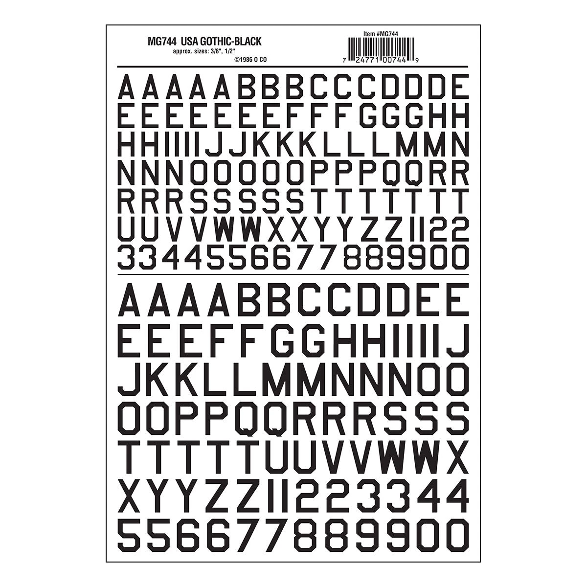 Letters and numbers in two different sizes-3/8″ and 1/2″ Black colored letters and numbers in 45 USA Gothic Font Transfers rub onto smooth or textured surfaces in seconds No cracking or ugly film Capable of withstanding severe stress and abuse and will not destruct when crumpled or folded. Shelf life is unlimited if kept clean and dry Most any clear spray (gloss or flat) can be applied over these because they’re solvent resistant. Versatile decal system for arts, crafts and hobbies