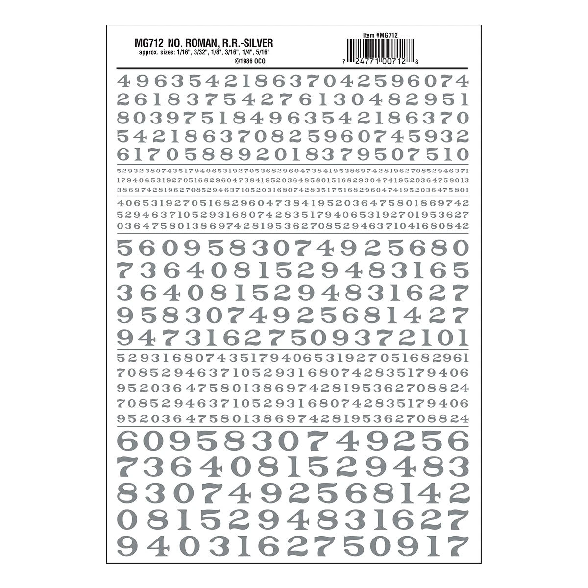 Letter sizes: 1/16″, 3/32″, 1/8″, 3/16″, 1/4″ (1.5, 2.3, 3.1, 4.7, 6.3 mm) Silver colored numbers in Railroad Roman font. Transfers rub onto smooth or textured surfaces in seconds. No cracking or ugly film. Capable of withstanding severe stress and abuse and will not destruct when crumpled or folded. Shelf life is unlimited if kept clean and dry. Most any clear spray (gloss or flat) can be applied over these because they’re solvent-resistant. Versatile decal system for arts, crafts, and hobbies.